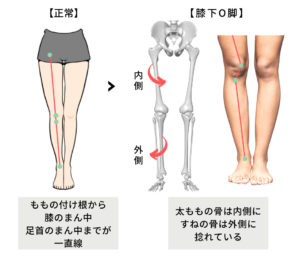 O脚は見た目のバランスが悪いだけでなく、膝関節や股関節へ負担が集中しやすい状態になっています。