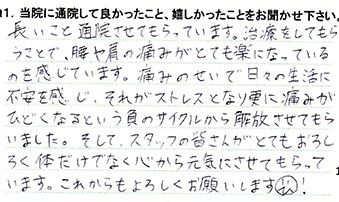 長いこと通院させてもらっています。施術をしてもらうことで、腰や肩の痛みがとても楽になっているのを感じています。痛みのせいで日々の生活に不安を感じ、それがストレスとなり更に痛みがひどくなるという負のサイクルから解放させてもらいました。そして、スタッフの皆さんがとてもおもしろく体だけでなく心から元気にさせてもらっています。これからもよろしくお願いします!