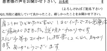 肩こりがひどかったのですが 1日でインナーマッスル光療法で痛みが引きました。